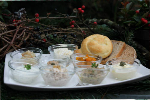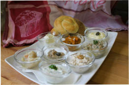Zucchini-Oliven-Creme, Kürbis-Mandel-Creme, Zwiebelschmalz mit getr.